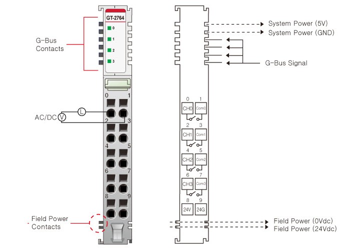 На практике же используются в основном 10RTB и 18RTB – хотя бы потому, что с такими разъемами гораздо проще работать «в поле» в части диагностики. К слову, о диагностике. В номенклатуре модулей с транзисторными выходами в серии G имеются модули с диагностическими функциями, как для Sink, так и для Source. Удобно то, что пользователь может увидеть сразу на месте, что с каналом что-то не так, благодаря наличию дополнительных светодиодов. Правда, конкретную причину сбоя эти светодиоды не покажут. Каждый тип модуля выпускается в двух вариантах – с защитой от короткого замыкания и без нее. Версия без защиты от короткого замыкания была выпущена в период дефицита полупроводниковых защитных элементов, связанного с запуском производства серии M в качестве эксперимента. Оказалось, что эти модули в основном ставятся совместно с релейной развязкой, так что наличие или отсутствие защиты от короткого замыкания на выходном каскаде не влияет на их работоспособность и срок службы. По этой причине завод установил приоритет на выпуск модулей серии G с транзисторными выходами без защиты от короткого замыкания, в то время как в серии M приоритетными стали модули с защитой от короткого замыкания. И если модуль дискретного вывода нужен быстро, то разумно отказаться от защиты от короткого замыкания (которая, как мы говорили ранее, большого смысла не несет) и поставить развязку каналов на промежуточных (интерфейсных) реле. В части релейных выходов у серии G ассортимент несколько скромнее. Если говорить о «сухих контактах», то здесь единственный вариант – модуль с 4 нормально разомкнутыми контактами и неплохим диапазоном коммутируемых напряжений (0~32 В DC, 0~48 В DC, 0~110 В DC и 0~240 В ВС). У модуля 10-контактный съемный клеммник, и это решение вполне понятно – разъемы типа IDC или ERNI в таком модуле неприменимы, все-таки мы говорим о серьезных уровнях напряжения, а не о безопасных для человека 24 В. Модуль в линейке один. А вот модулей с твердотельными реле больше – по паре (4 и 8 каналов) на каждый из номиналов напряжения, 24, 110 и 240 В постоянного или переменного тока. В нашей промышленности эти модули большого распространения не получили, да и стоят дороговато, чтобы с ними экспериментировать.