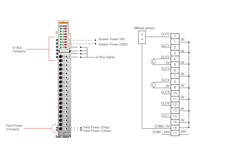 | Общие контакты | 2 контакта (0 В и 24 В) |